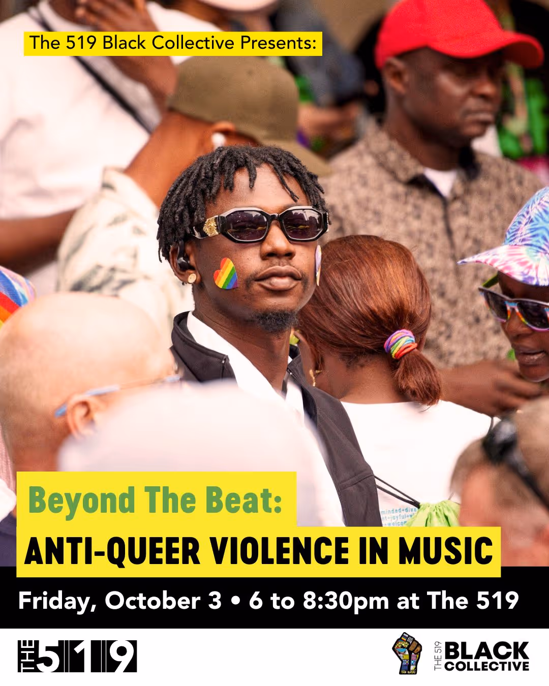 The 519 Black Collective presents Beyond the Beat: Anti-Queer Violence in Music, an in-person panel at The 519, on Friday, October 3 from 6 to 8:30 pm. This panel will be moderated by Courtnay McFarlane, and will include Polly Perry, Dr. ABC, Craig Dominic, DJ Blackcat, DJ Fresh Kidd, Kevin “Bubbles” Adams, and more. There will be a delicious meal, and brief dance party following the discussion.
