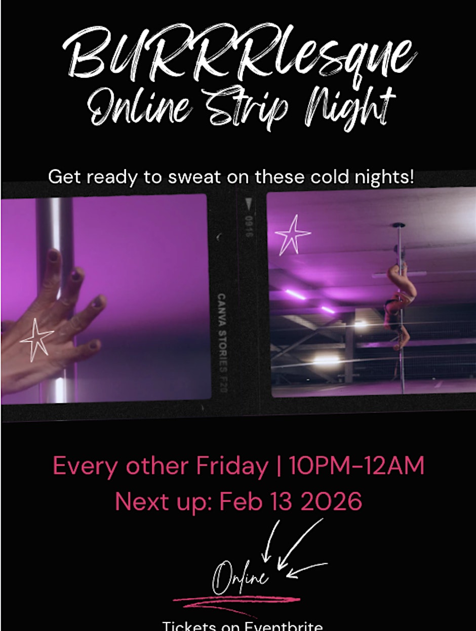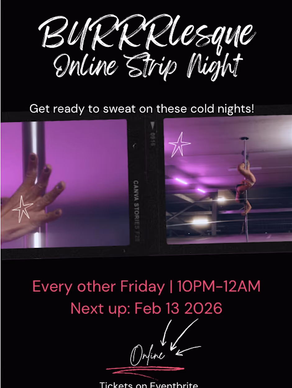 Join us online for a dazzling night of burlesque fun and queer, melanated finesse! Expect spicy performances, bold choices, and a whole lot of giggles and drips from the comfort of your own space. Whether you're a seasoned fan or just curious, BURRRLESQUE will bring the glam right to your screen. Grab your favorite snacks and get comfy — this is one event you'll be remiss to miss!