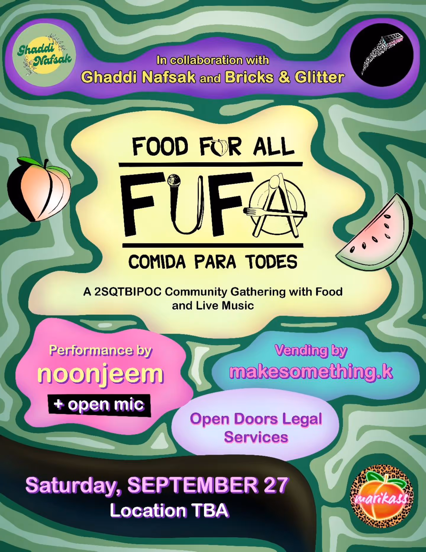 Food for All or Comida para Todes is a 2SQTBIPOC centered gathering with food and live music.