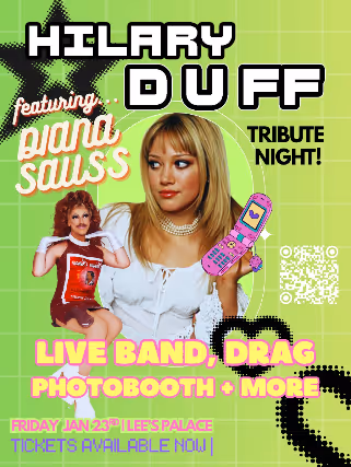On JAN 23RD (the night before Hilary plays Toronto) join us as we bring back the twice sold out HILARY DUFF NIGHT, this time to LEE’S PALACE! From Metamorphosis to Mature, experience the unforgettable music of Hilary Duff performed live. Toronto favourites Päter and Holly Clausius will have you shaking off the woes of 2026 as you ascend into the pure bliss of the early 2000s. PLUS there’ll be drag (hellooo Diana Sauss), a photobooth and more! Come dressed to the nines and be prepared to shout along to all the hits.