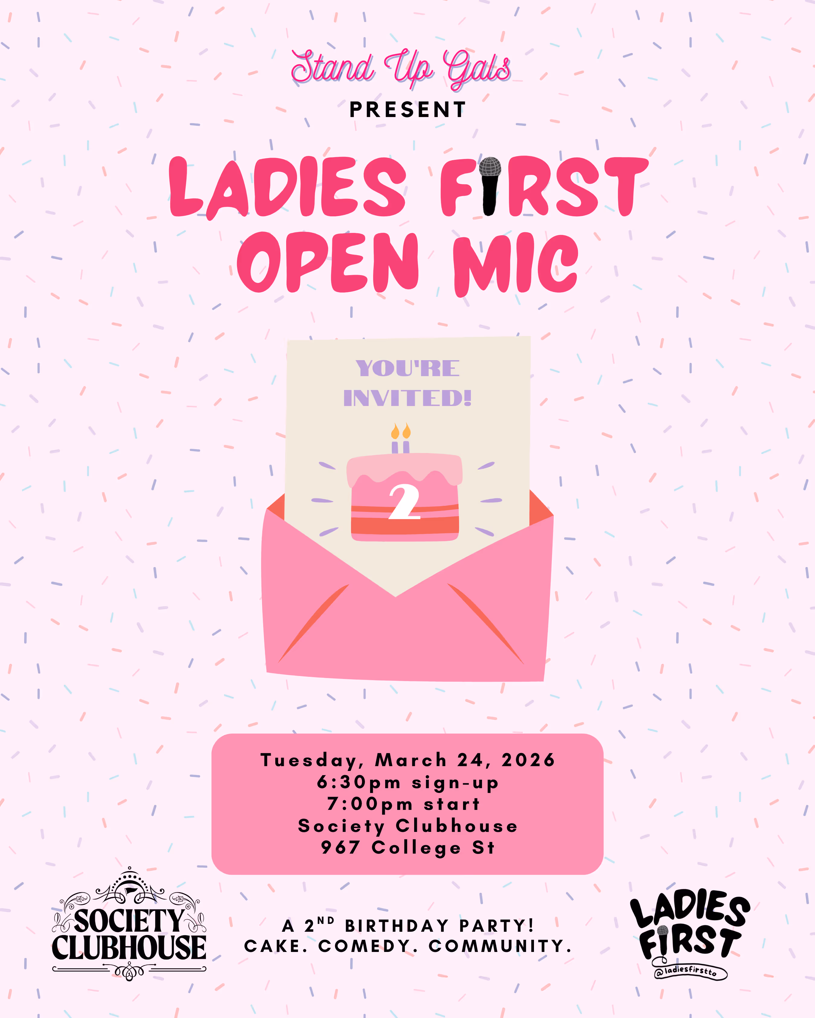 Toronto's friendliest open mic, Ladies First, will celebrate its second birthday on Tuesday March 24 at 7pm at Society Clubhouse. The birthday will include regular open mic slots in addition to six feature spots in which fav comedians of the mic perform longer sets. Join us for a free evening of comedy, community and (of course) birthday cake!
