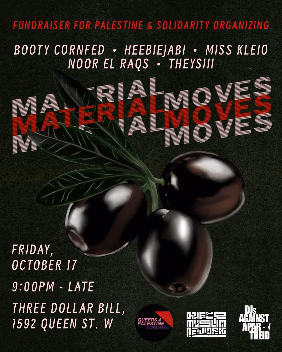 Join Queers 4 Palestine, Queer Muslim Network, and DJs Against Apartheid for Material Moves, a DJ night and dance party fundraiser for mutual aid in Palestine and Tkaronto!