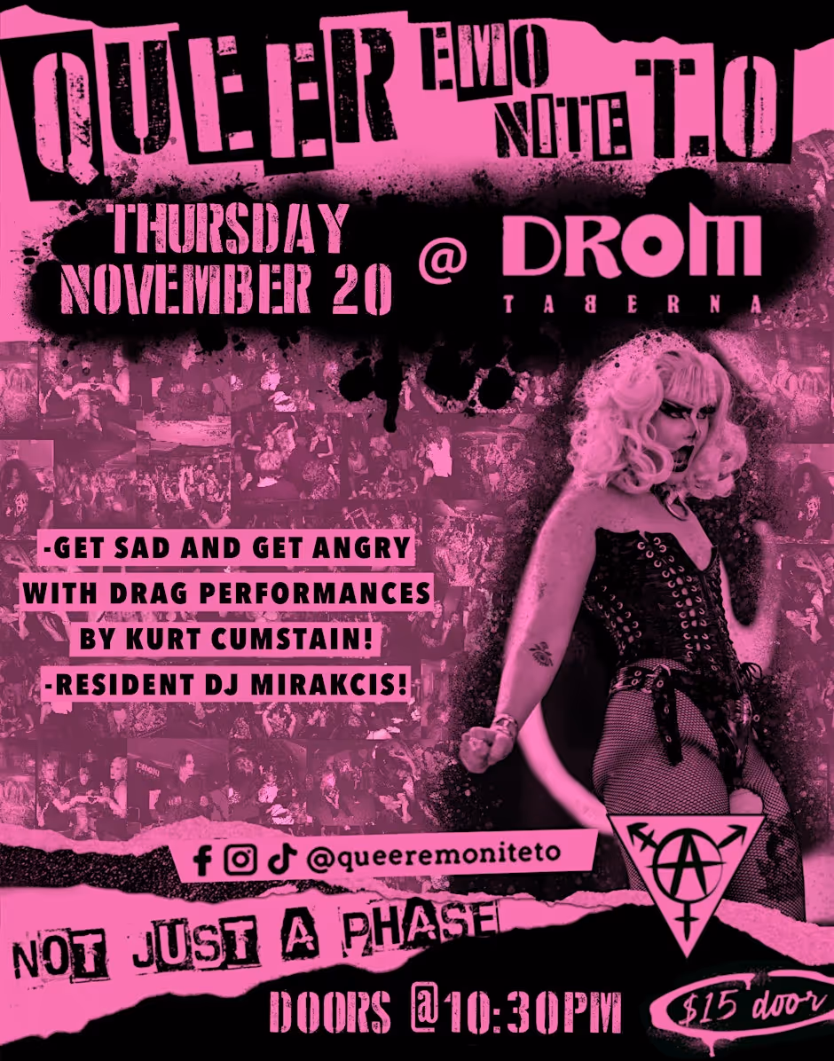 Come party with Queer Emo Nite TO at DROM Taberna! Get ready for a night filled with your favourite emo tunes, queer anthems, and of course, a drag show by the one and only Kurt Cumstain!