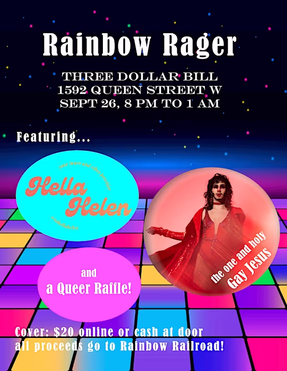 Party for a cause at Three Dollar Bill this Thursday September 26th in support of Rainbow Railroad. Rainbow Railroad helps LGBTQI+ people escape violence and oppression to live safely and authentically in a new country. All funds raised through admission and raffle tickets will go directly to support the settlement of a recently arrived refugee from Uganda (https://donate.rainbowrailroad.org/team/521539). Drinks and mingle at 8pm, beats from DJ Hella Helen (@sohellahelen) at 10pm, and a drag performance by the one and only Gay Jesus (@theirholiness), plus amazing raffle prizes from the likes of Yohomo and the legendary drag pop superstar Priyanka- this is a party that you can feel good about. Tickets on Eventbrite, or a suggested $20 donation at the door!