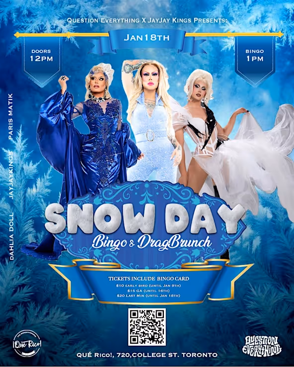 We are doing THAT! but with drag, drinks, and $1500 in tv worthy prizes at "Question Everything x Jayjay Kings Presents: SNOW DAY Bingo & Drag Brunch"!