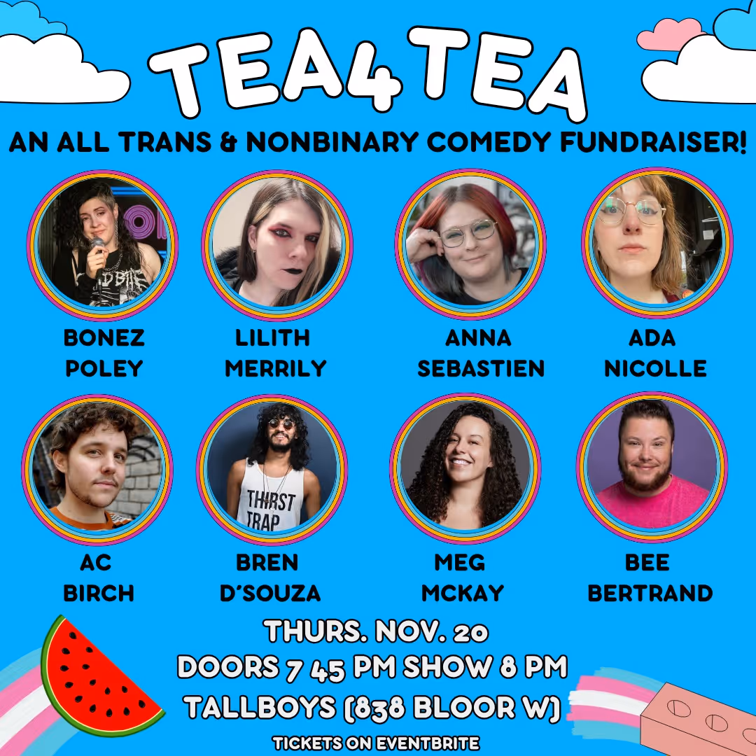 Tea4Tea is all about having a blast while gathering in community, celebrating the amazing comedic talent in Toronto, and getting some hard earned trans and queer joy! This is an extra special fundraiser edition that is one small part of taking care of each other in hard times.