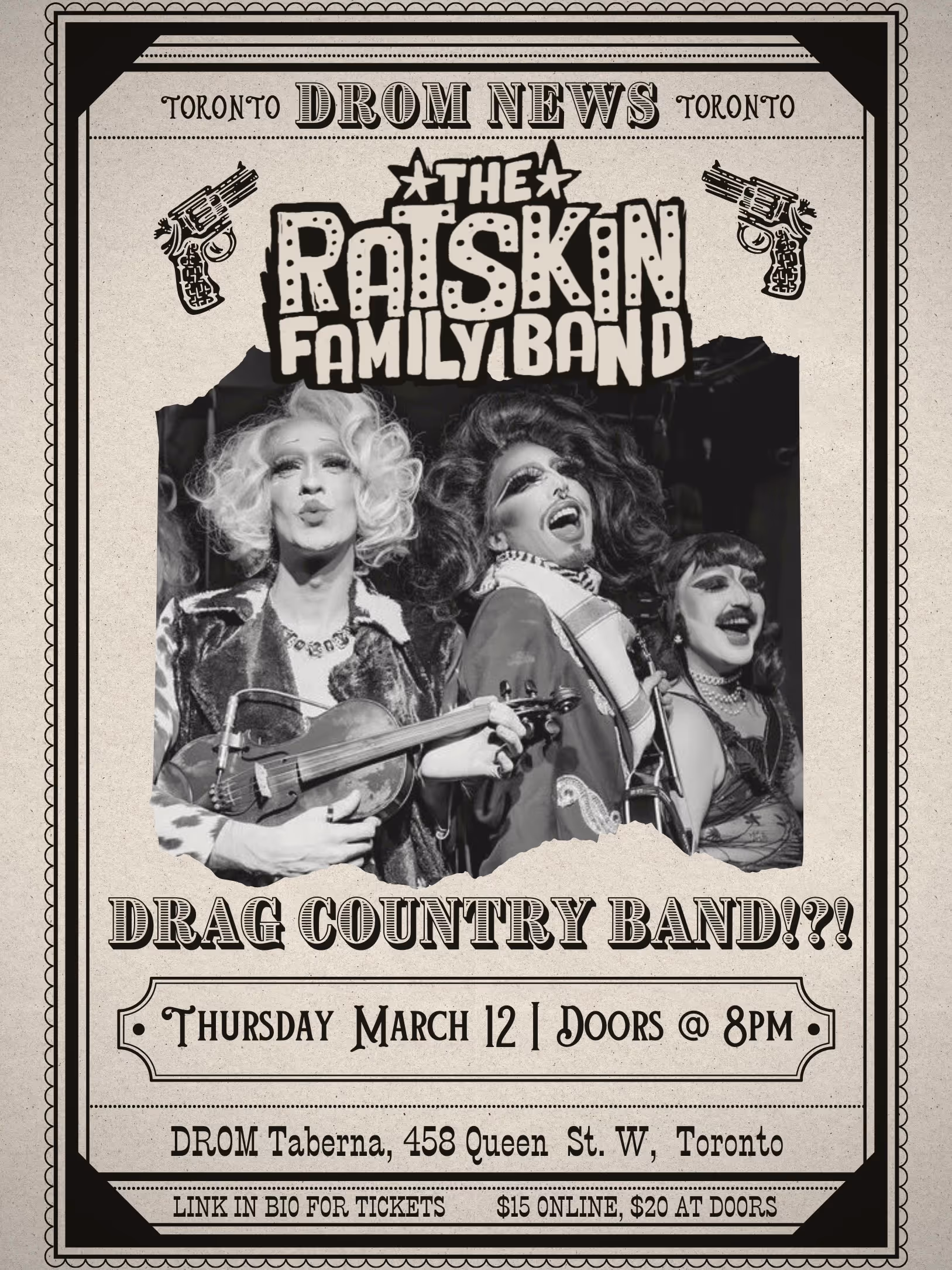 For decades Country and Western fans have been begging for an all drag queen, king and thing band. The Ratskin Family Band is an answer to these prayers. This glamorous group of critters plays country standards, reimagined pop hits and original country songs with Queer themes. In this band you will find familiar faces to Toronto’s drag scene as well as new performers. Join Amanda Prior, Kitty Creature, Tago Mago, Zephline, Terry Dickoff and Candice Bich-Reed for a drag show like no other and a concert the likes of which can’t be found anywhere else on this planet MONTHLY at Drom Taberna, second thursdays at your fave live music spot!